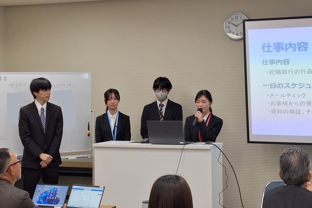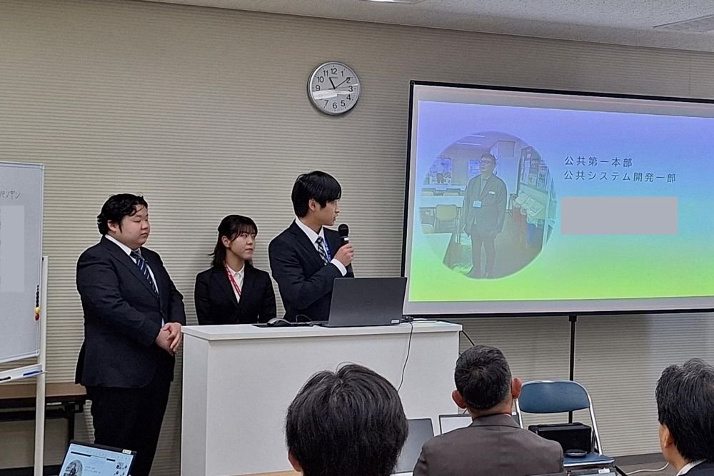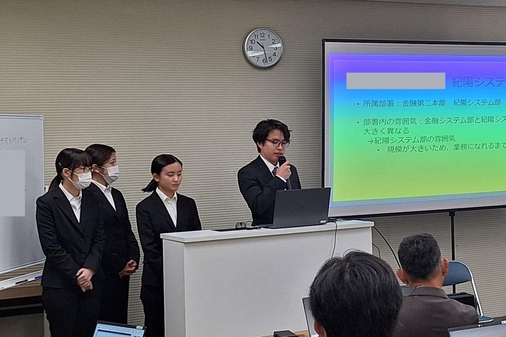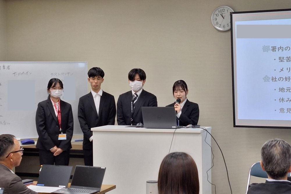 発表会は、社長や役席、先輩社員の前で1班あたり約20分の発表を行いました。発表資料は、どの班もイラストや写真を使用しており、全体的な色味が統一され、デザインの工夫が見られました。また、情報の重要度によって文字の大きさや色が変更されていたりと、発表を聞く人にとって見やすく、理解しやすい資料を作成されていました。